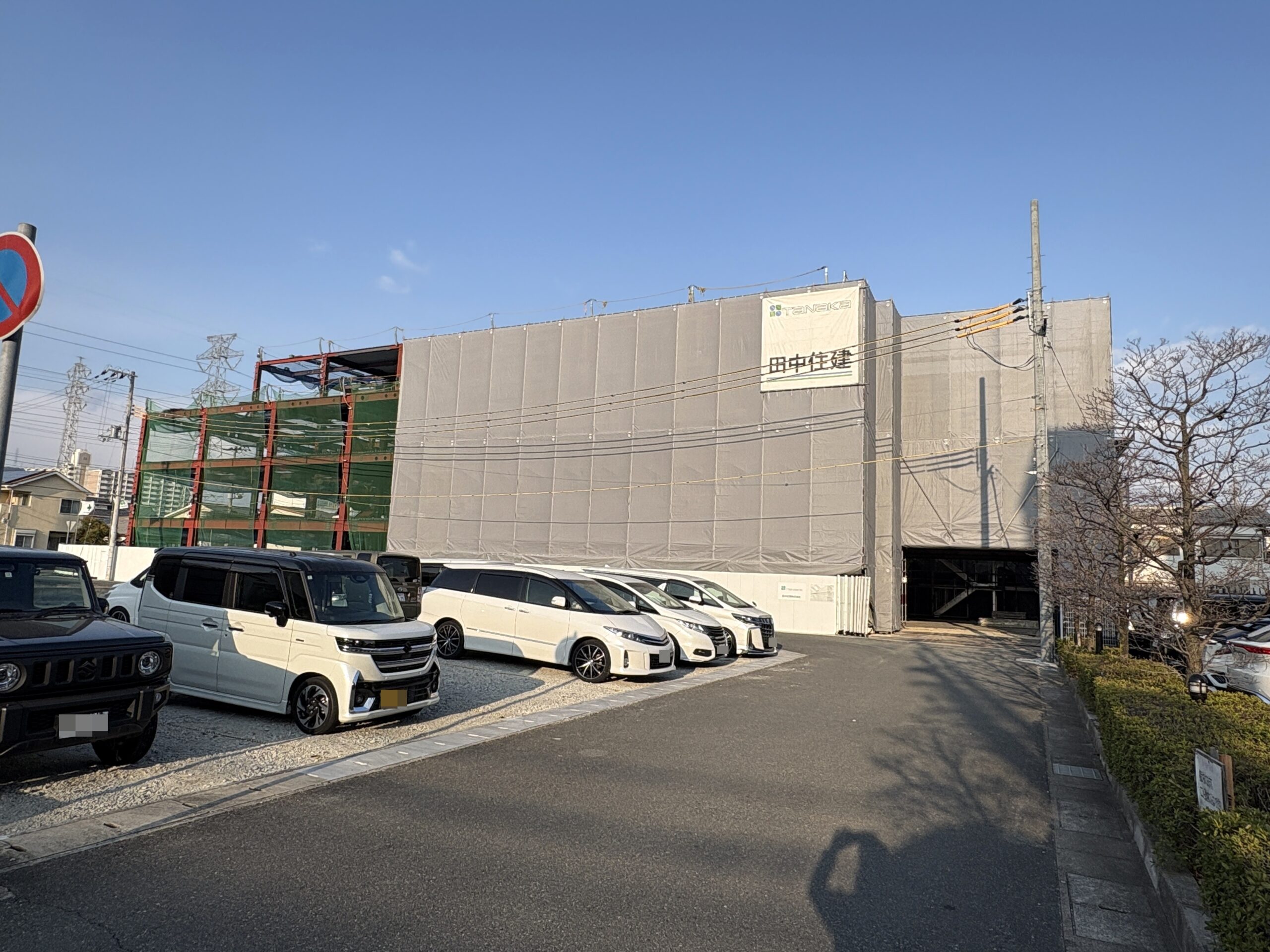 こうして立体的な姿が現れると、いよいよ建物としての実感が湧いてまいります。現在は安全確保のための養生シートに覆われておりますが、内部では着々と次の工程の準備が進んでいます。